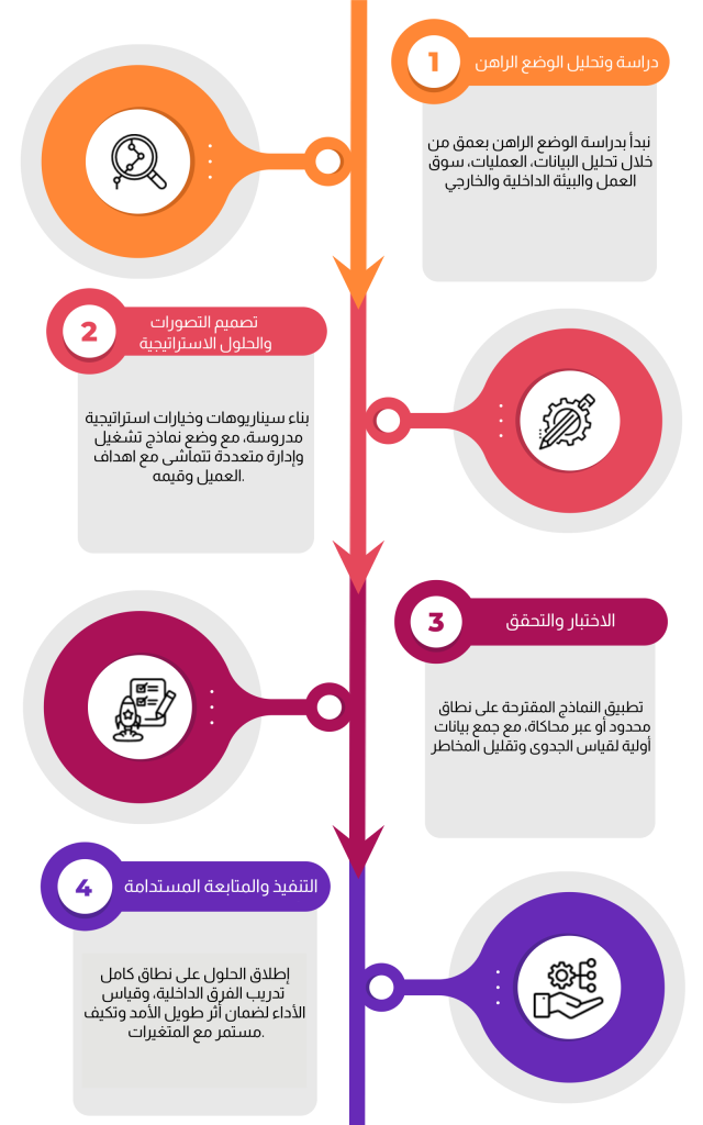 بعد تشخيص التحديات والفرص، نضع التصوّرات والحلول المقترحة بالتعاون مع العميل، بحيث تعكس رؤيته وتستند إلى أفضل الممارسات العالمية.